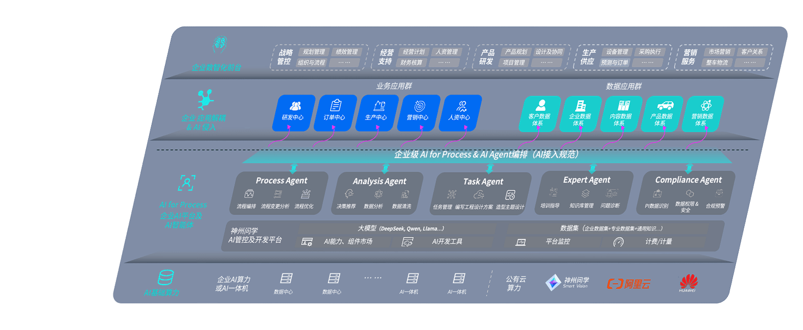 端到端的一站式AI工作空间深度融合了从企业战略规划到日常经营的全流程业务板块,,定向解决车企内部领域多、、部门多、、链条长、、、、场景碎片化等难题,,,支持车企快速构建以AI为核心的生产力写作体系,,,实现任务执行与AI能力的无缝集成与交互