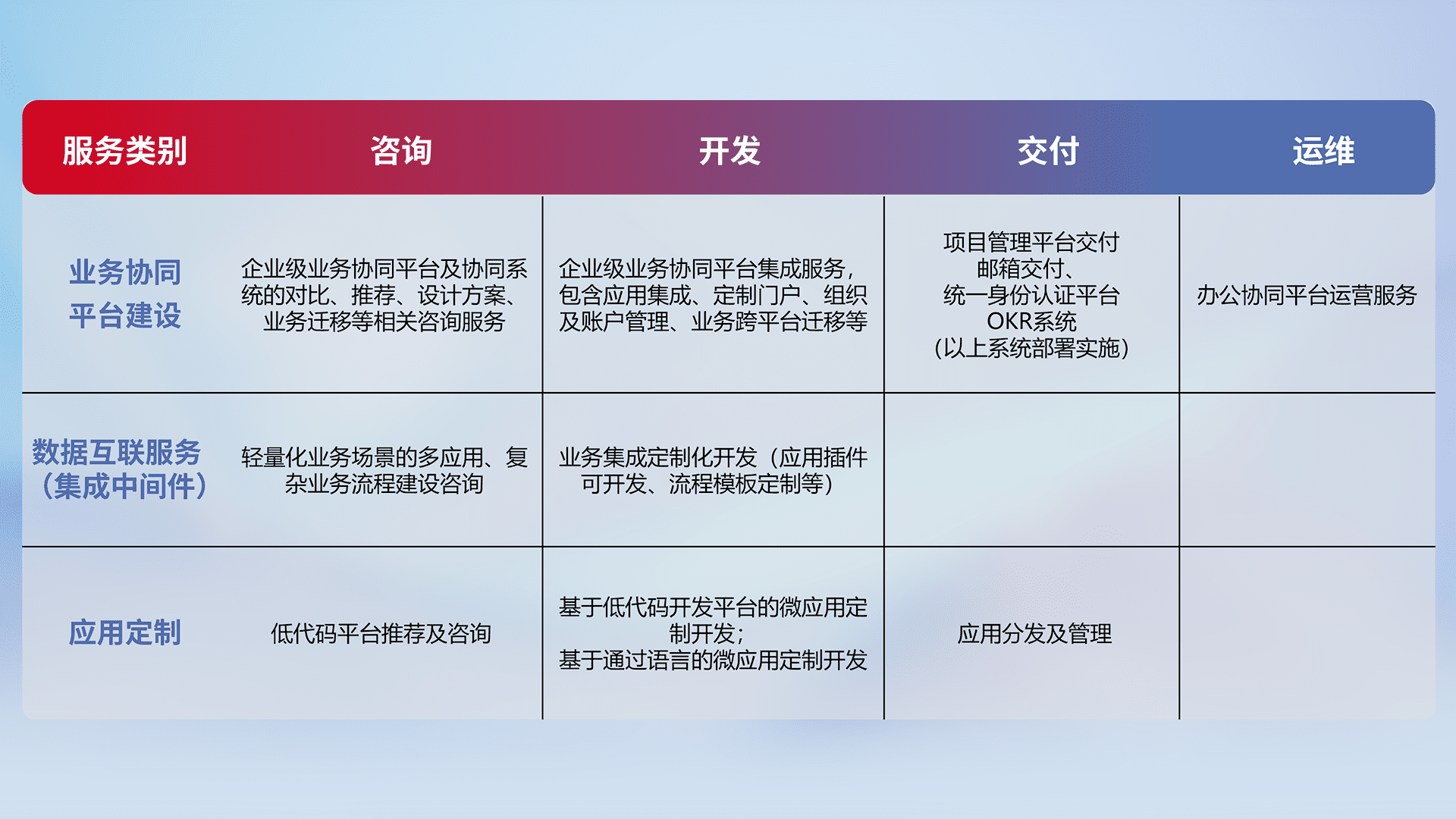 针对钉钉、、、、企微、、、IDaas等平台级产品提供产品的规划、、、、方案、、、、交付、、定制化开发等服务,,实现如统一协同办公、、、智能客户服务、、混合会议管理、、、、智能数据查询、、等业务场景,,,实现数字化转型。。。