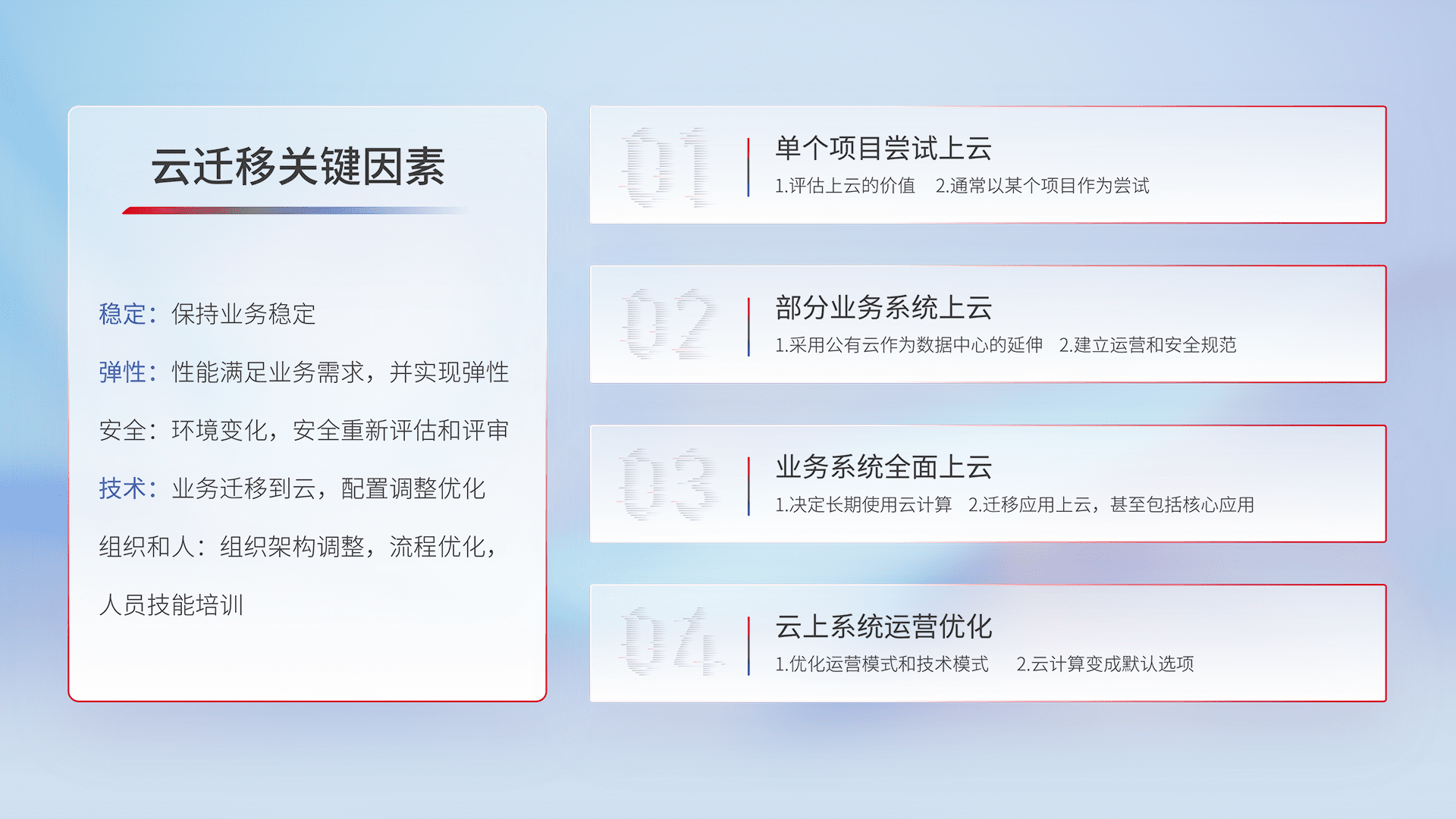 结合实际业务,,,,从规划设计、、、、云平台选型、、、、云原生改造、、、数据迁移、、、、集成交付,,,,迁移全过程为客户识别最佳上云路径,,做好风险识别管理,,,设计网络架构、、身份权限、、安全审计合规、、操作审计、、日志审计、、监控告警策略、、、多站点容灾设计等,,对云上基础设施进行整体规划,,,,提升IT治理水平,,,,以满足弹性、、、、高可用、、、、高性能的需求。。。。