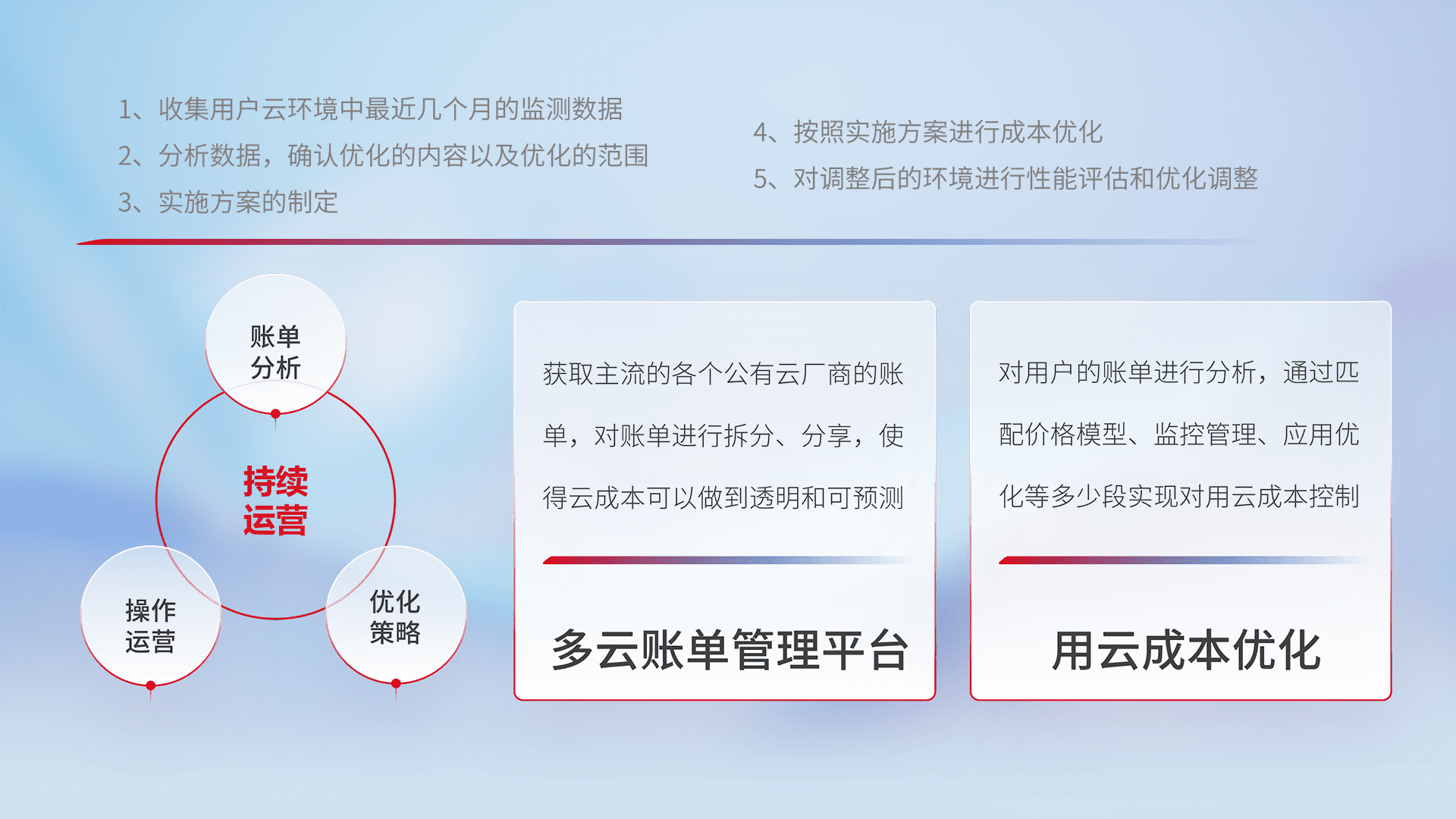 通过多云纳管,,,以统一的资源数据模型把客户的云资源进行抽象和封装,,,进而实现对多云资源的统一操作,,,,保障云资源管理的可靠性、、稳定性与可用性。。量身定制化运维内容,,,配置、、开发运维、、补丁管理、、、备份、、、、监控、、认证和访问管理、、、、审计和日常巡检等,,,保障在用云过程中的可靠度,,稳定度以及高可用率。。。。