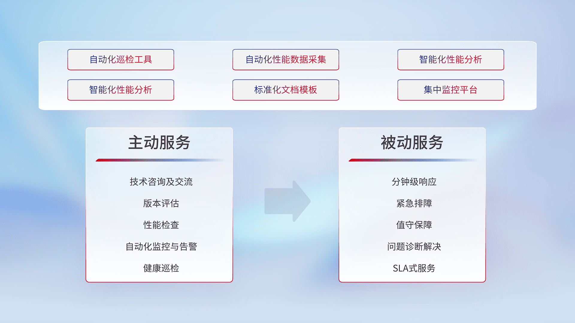 智能化工具和标准化文档,,,保障服务质量,,,,提供主动服务(包含技术咨询、、版本评估、、性能检查、、、自动化监控与告警、、健康巡检)和被动服务包含(分钟级响应、、、、紧急排障、、值守保障、、、问题诊断解决、、、、SLA服务)。。。